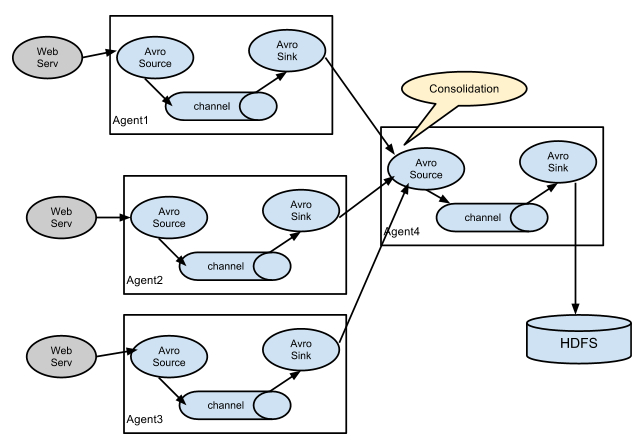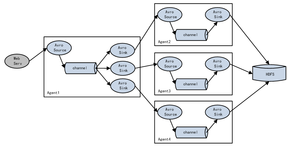 这种情况应用的场景比较多,比如要收集Web网站的用户行为日志,Web网站为了可用性使用的负载均衡的集群模式,每个节点都产生用户行为日志,可以为每个节点都配置一个Agent来单独收集日志数据,然后多个Agent将数据最终汇聚到一个用来存储数据存储系统,如HDFS上。
